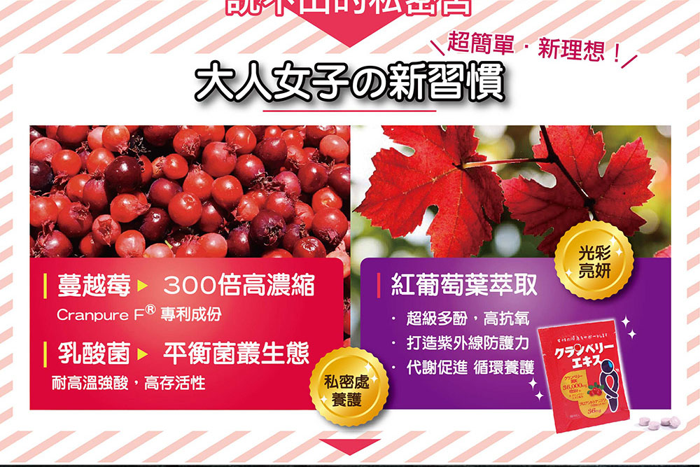 主成分:蔓越莓萃取物(含前花青素)Cranpure F® 300倍濃縮、植物性奈米型乳酸菌SNK®、紅葡萄葉萃取物