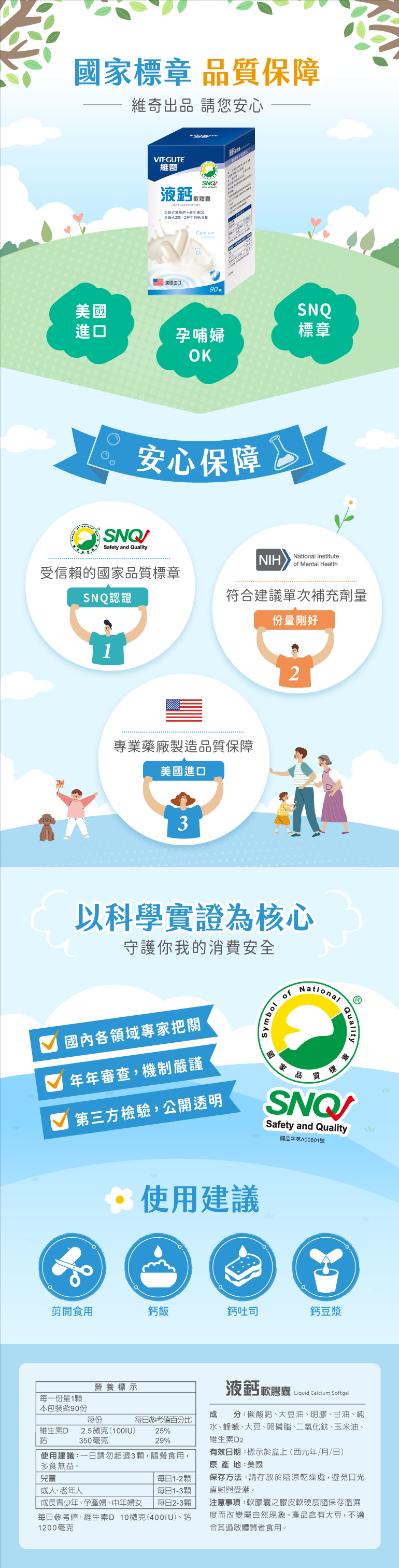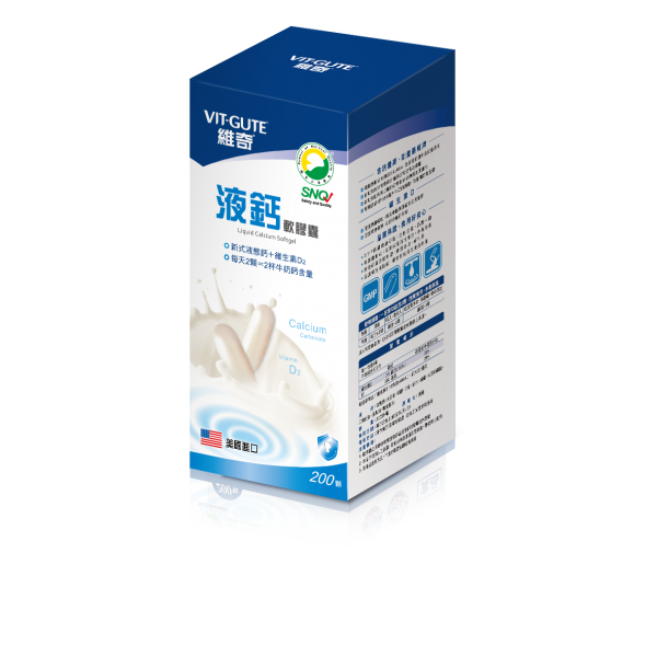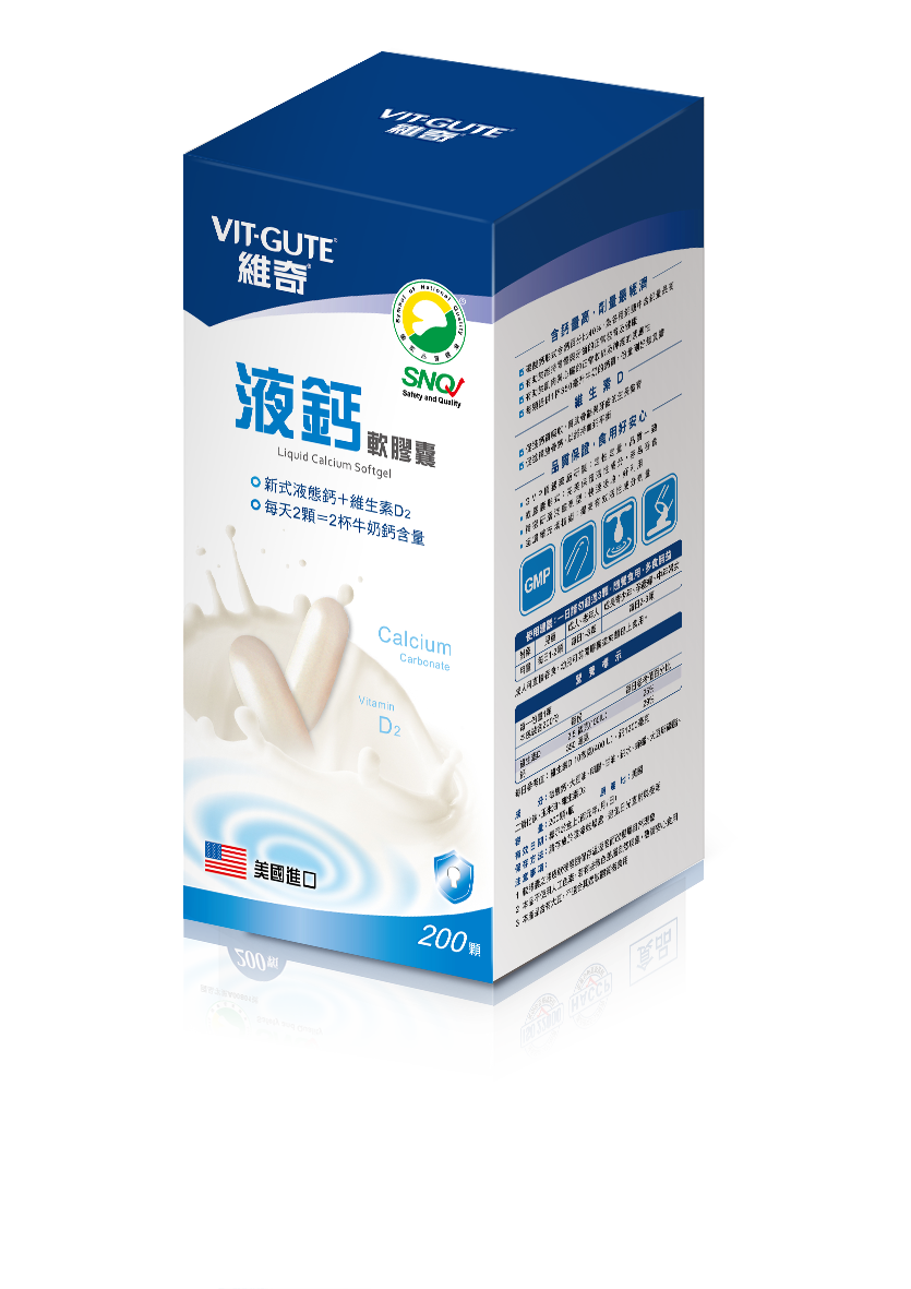 成份:碳酸鈣、大豆油、明膠、甘油、純水、蜂蠟、大豆卵磷脂、二氧化鈦、玉米油、維生素D2