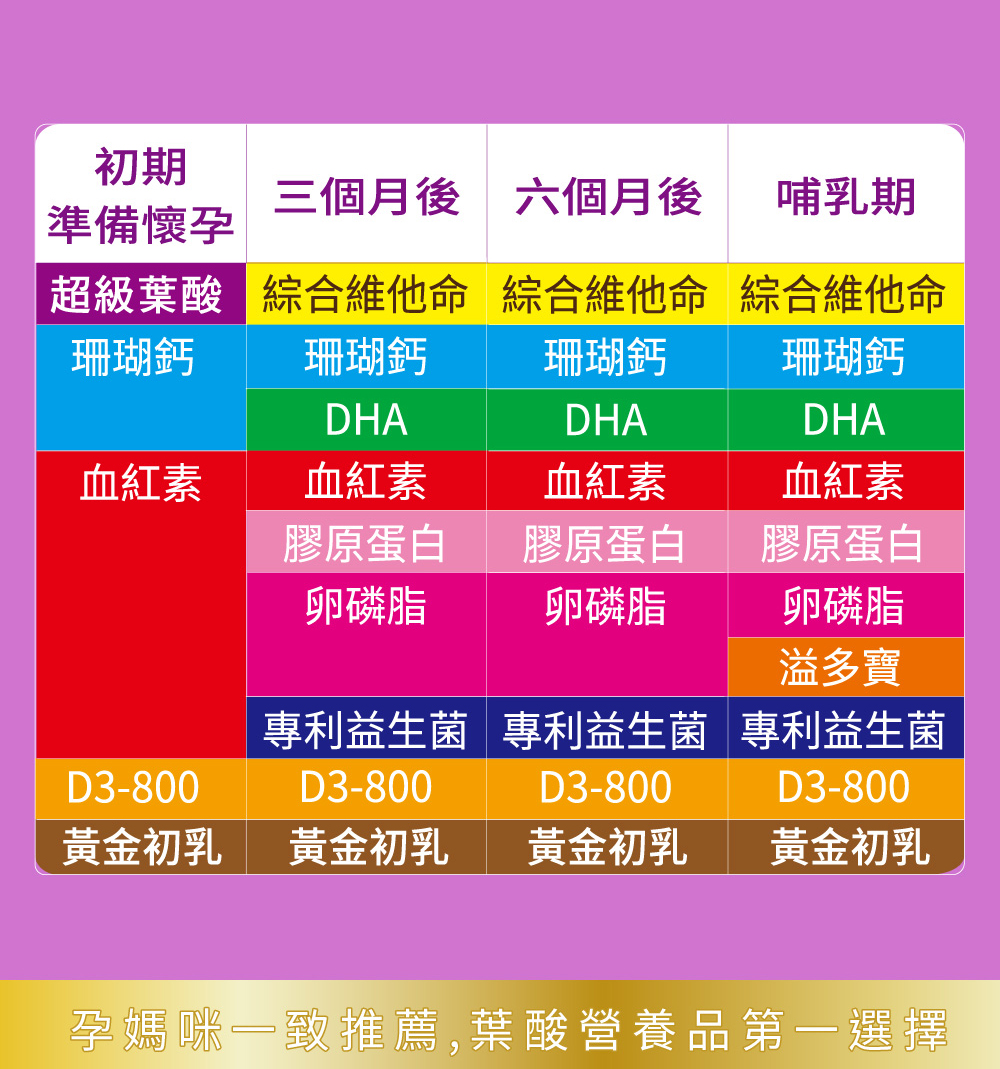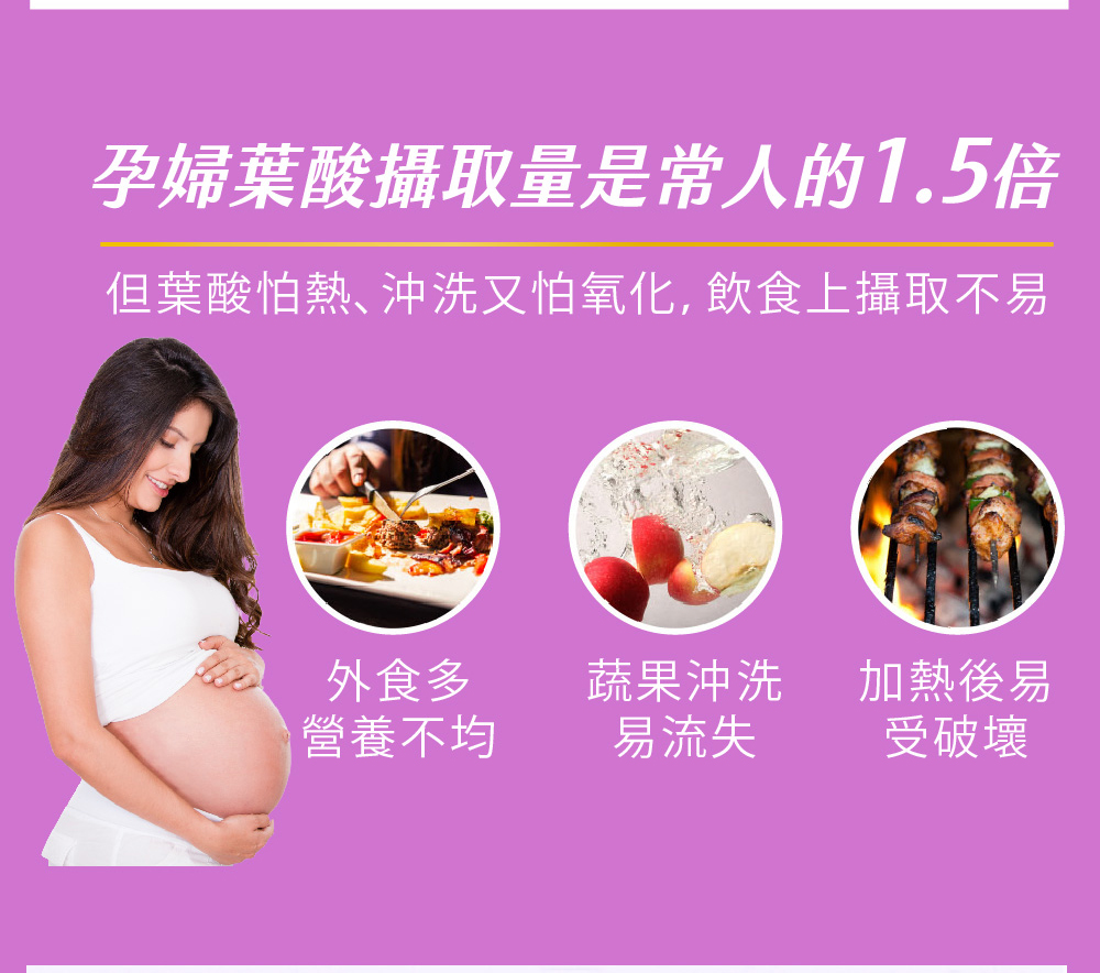 ●葉酸在懷孕初期扮演很重要的角色,葉酸有助於紅血球、核酸與核蛋白之形成,更是胎兒的正常發育與生長不可或缺之營養素