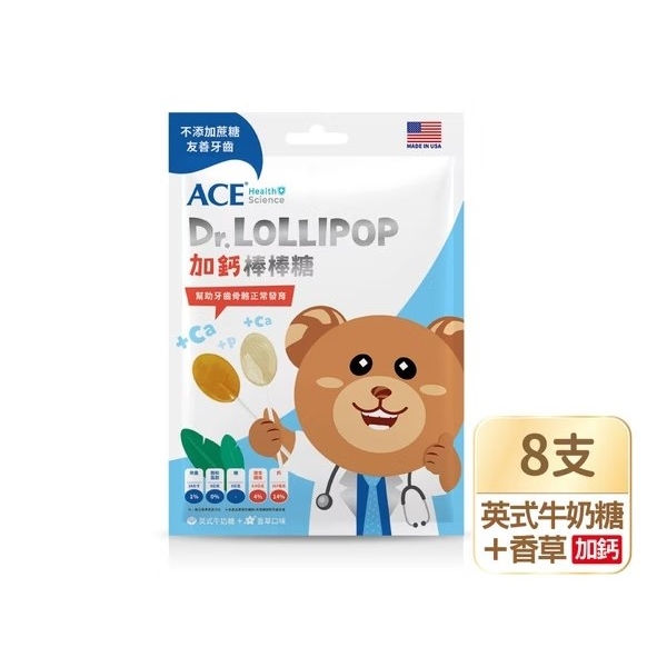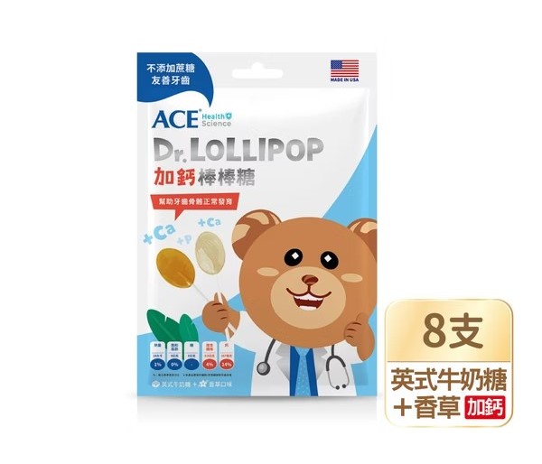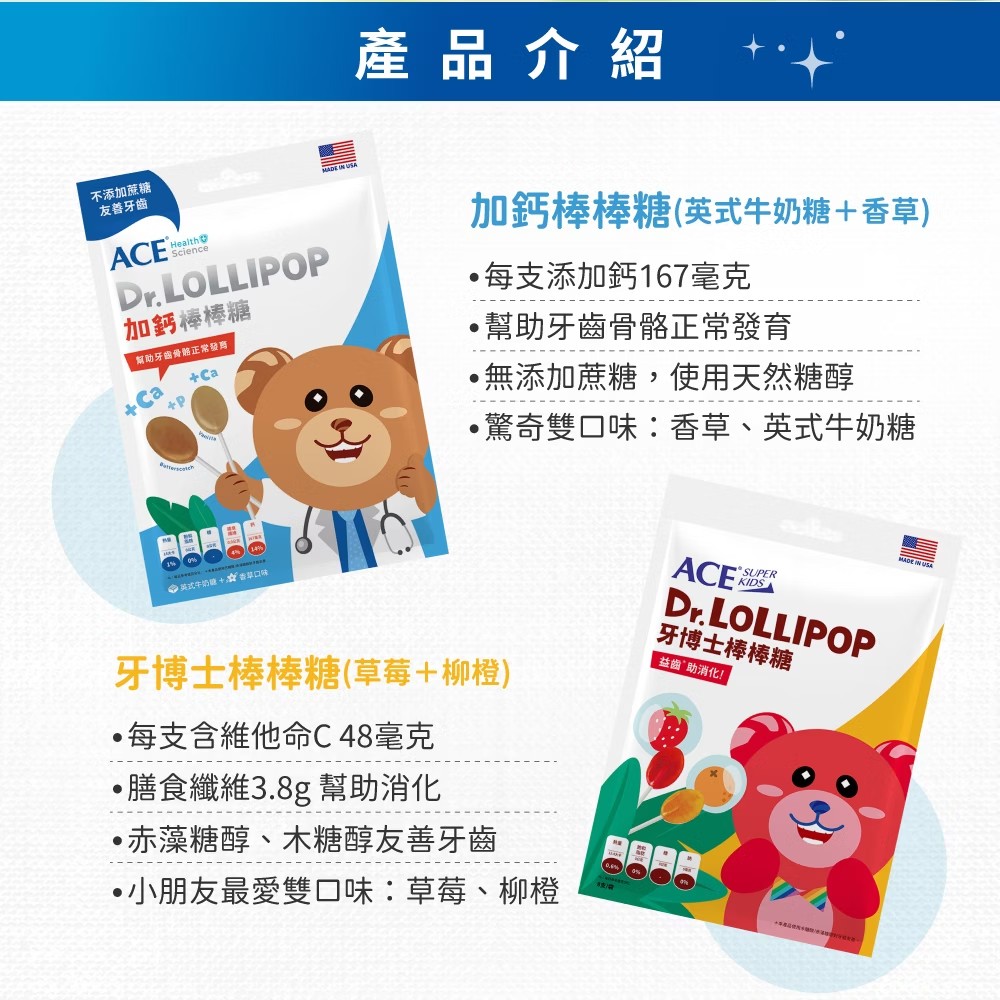 【ACE】SUPER KIDS牙博士加鈣無糖棒棒糖8支/袋|香草+英式牛奶糖