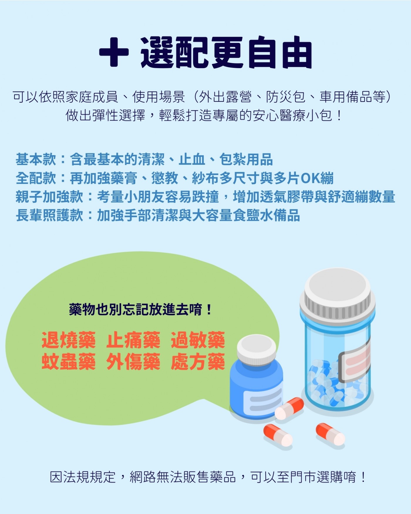 你可以依照家庭成員、使用場景(外出露營、防災包、車用備品等)做出彈性選擇,輕鬆打造專屬的安心醫療小包!