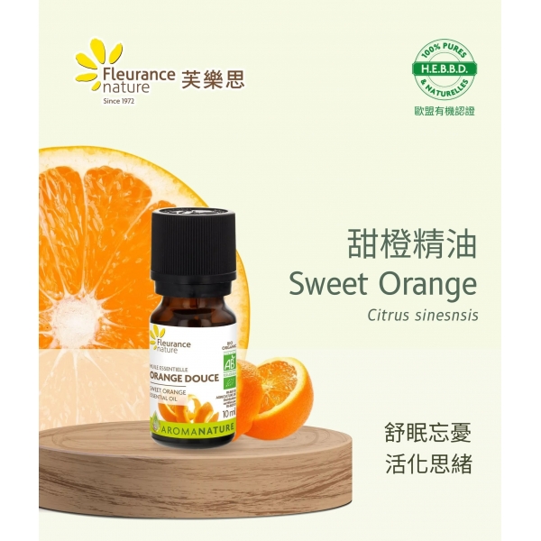 甜橙為橙樹的果實,是世界上第四大栽培的水果。它原產於中國,於15世紀末由葡萄牙航海家傳入歐洲。對於歐洲人來說,甜橙是非常珍貴的植物,文獻記載西班牙人經常利用甜橙的輕甜香味來舒緩消化不良及宿醉的噁心感。甜橙精油的價格親民,是眾多芳療初學者愛用的精油之一。