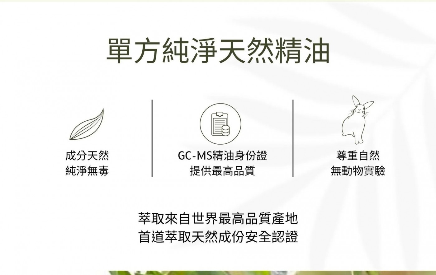 - 保存位置:請將精油置於陰涼乾燥處,並放在孩童無法觸及的地方。