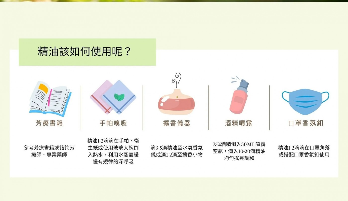 - 參考專業書籍或諮詢專家:建議查看芳療書籍或諮詢芳療師及藥局藥師,獲取使用建議。