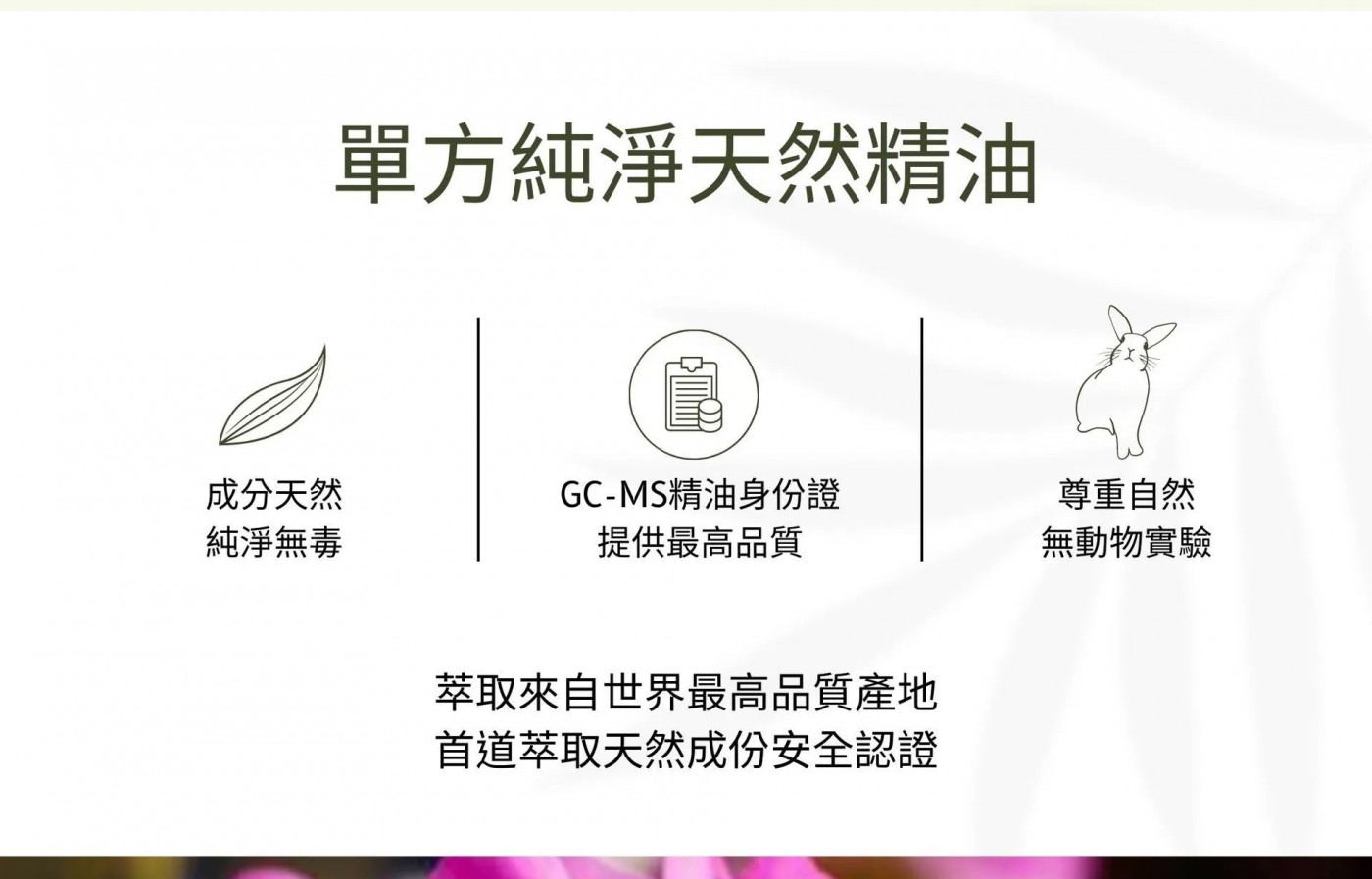 每一批芙樂思精油均配有GCMS精油身份證及Ecocert歐盟有機認證,確保品質安全。我們僅取第一道最濃郁的芳香精油,堅持不使用化學溶劑萃取的劣等精油。