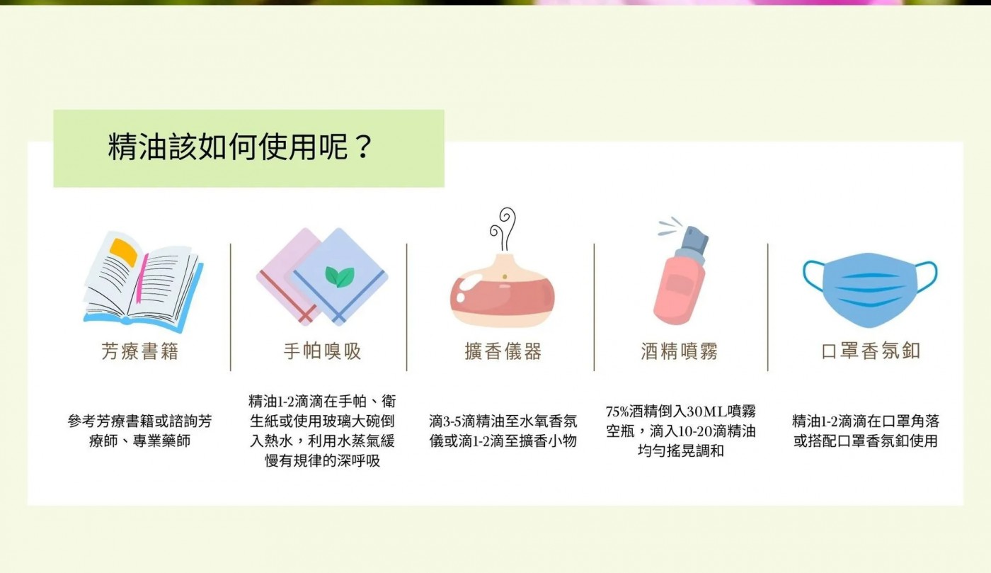• 參考專業書籍或諮詢專家:建議查看芳療書籍或諮詢芳療師及藥局藥師,獲取使用建議。