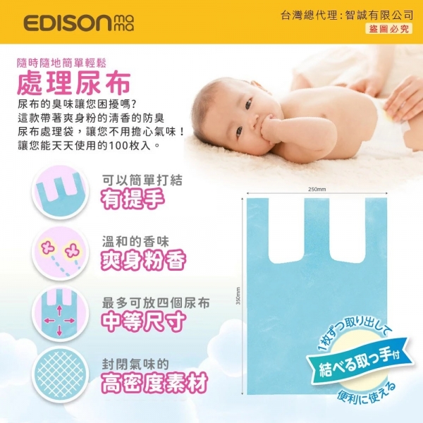 ●優質嬰兒爽身粉香味,抑制尿布令人不適的異味,並採用高密度材質,阻隔異味飄散出