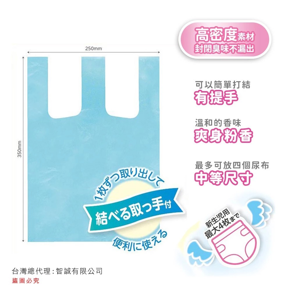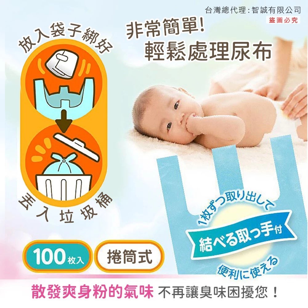 使用方法:使用後的尿布,將髒污面捲起再置人袋中,確實打結後丟到垃圾桶。