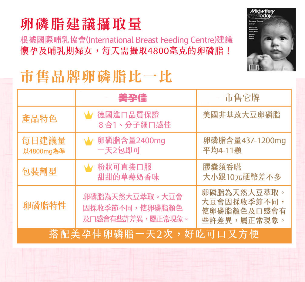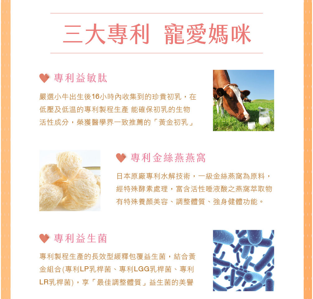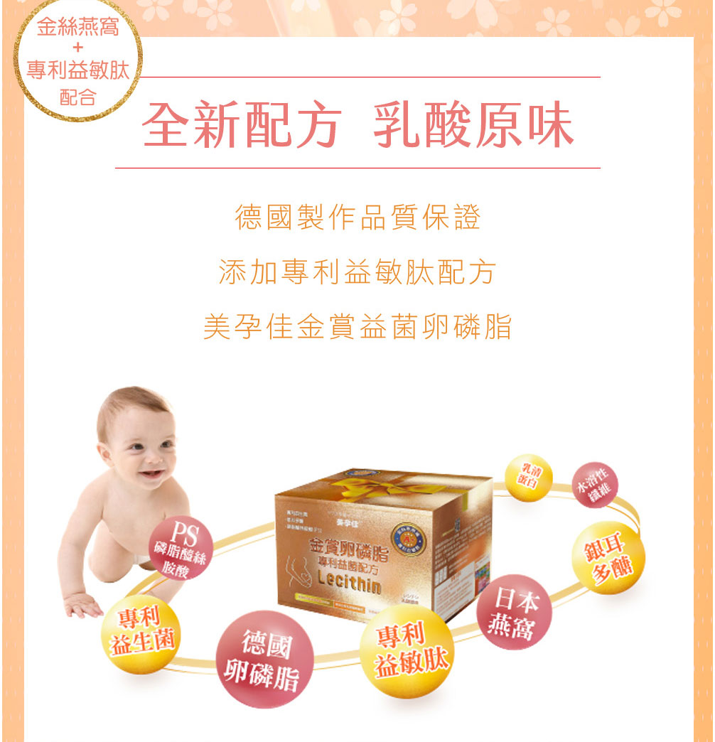 成分:大豆卵磷脂(德國非基因改造(97%高純度;含磷脂膽鹼))、 玉米來源可溶性纖維(日本專利Fibersol-2)、乳酸粉、乳糖、果寡糖、初乳粉(專利益敏肽)、乳清蛋白、 大豆蛋白、優格香料粉、蘋果酸、銀耳萃取物(含銀耳多醣)、乳酸菌(L..reuteri專利羅伊式乳桿菌、L..paracasei專利副乾酪乳桿菌、L..rhamnosus專利鼠李糖乳桿菌)、磷脂醯絲胺酸PS、燕窩抽出物(金絲燕燕窩;日本專利)