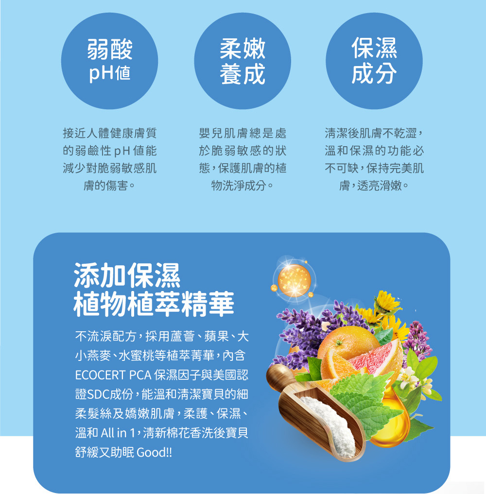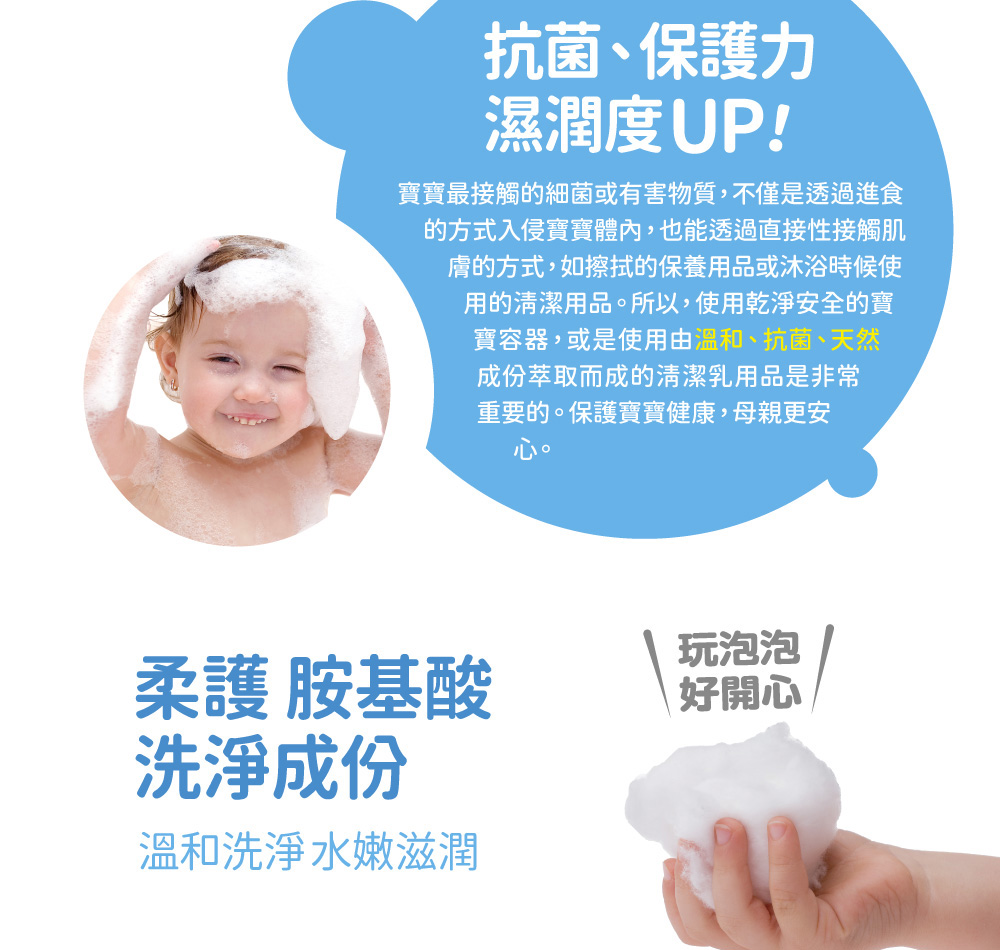 ●添加水解小麥蛋白清潔照護細柔髮絲,蘆薈、蘋果、水蜜桃與人蔘等多種精萃成份,保護嬌嫩的寶寶肌膚