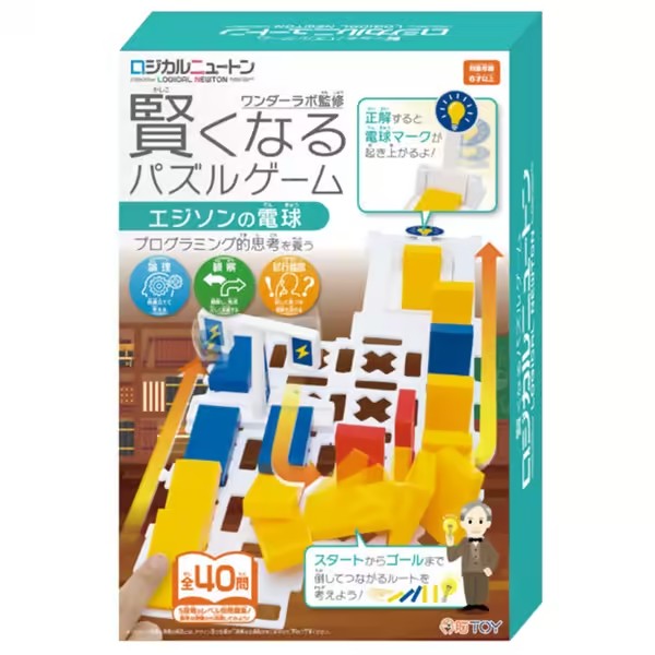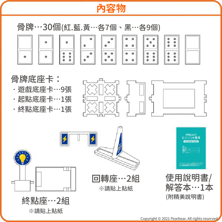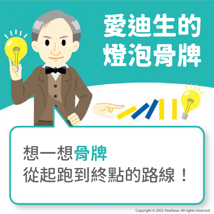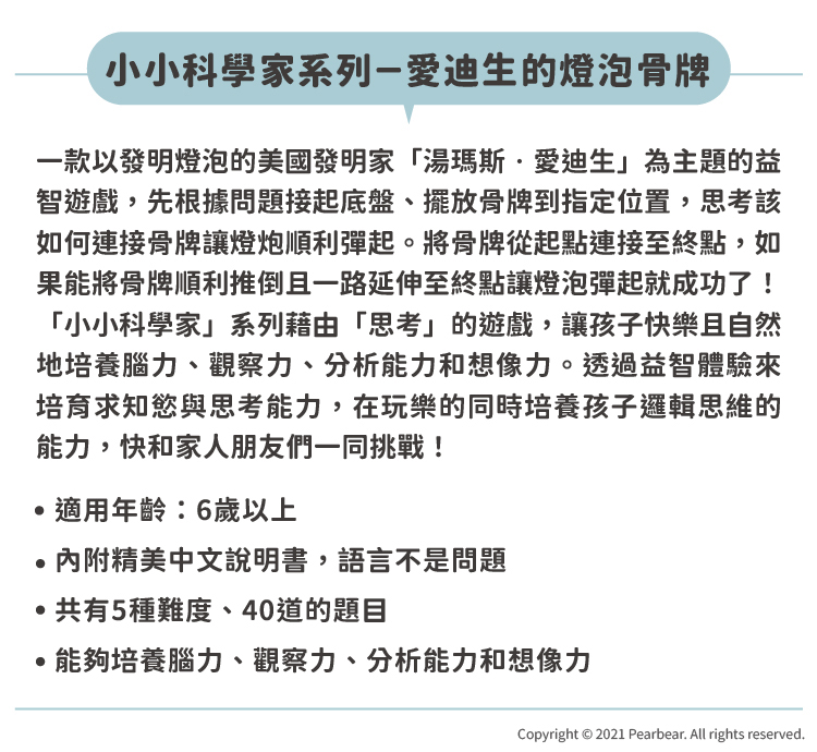 ●一款以發明燈泡的美國發明家「湯瑪斯‧愛迪生」為主題的益智遊戲,先根據問題接起底盤、擺放骨牌到指定位置,思考該如何連接骨牌讓燈炮順利彈起。將骨牌從起點連接至終點,如果能將骨牌順利推倒且一路延伸至終點讓燈泡彈起就成功了!「小小科學家」系列藉由「思考」的遊戲,讓孩子快樂且自然地培養腦力、觀察力、分析能力和想像力。透過益智體驗來培育求知慾與思考能力,在玩樂的同時培養孩子邏輯思維的能力,快和家人朋友們一同挑戰!