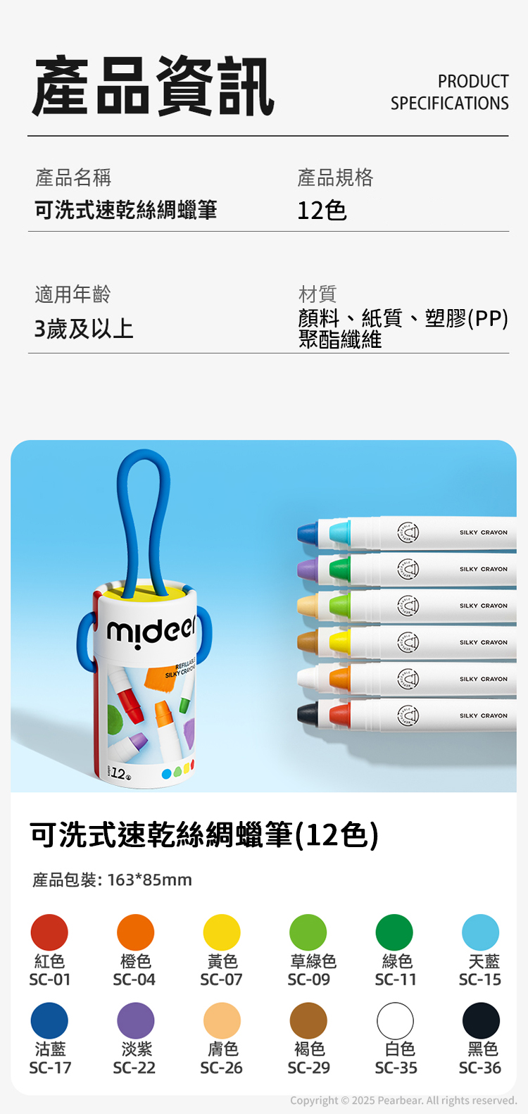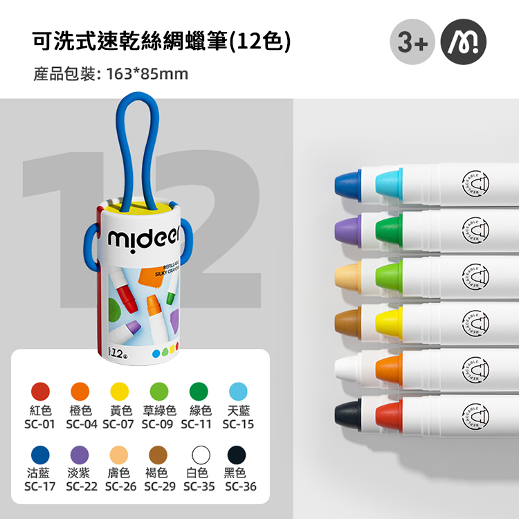 MiDeer 可洗式速乾絲綢蠟筆 (12色)