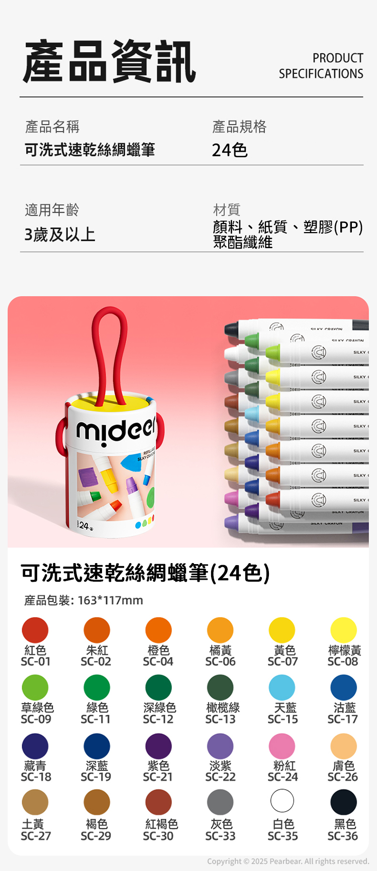 多項檢測保障的安心原料,無合成蠟乾淨安心,植物甘油成分絲滑順暢,並且有大容量的蠟芯。可水洗,不論顏料在手上、衣服上,只需要用水沖洗即可乾淨。不規則圓柱筆桿設計貼合小手的握筆習慣,圓滾滾的筆桿讓低幼孩子握筆更輕鬆。多達36色的選擇能夠培養藝術創造力,19mm大尺寸筆蓋設計,可防止吞食。手提包裝方便攜帶。