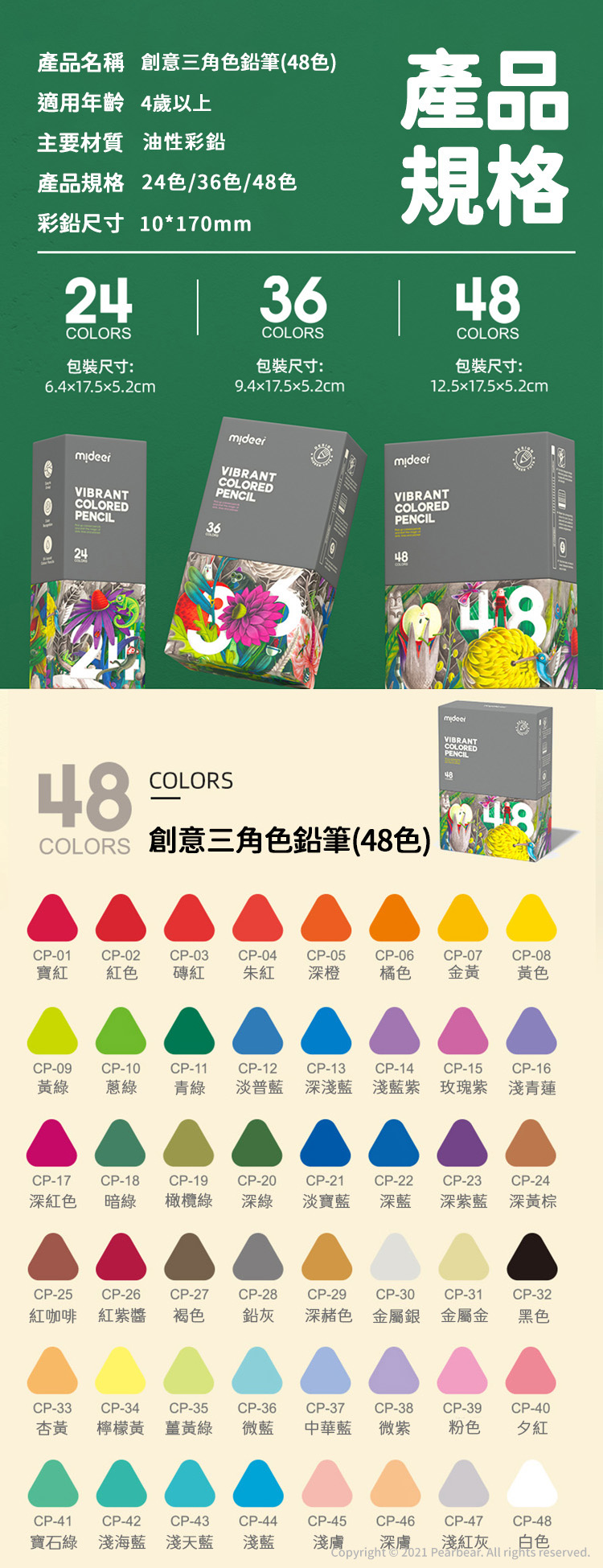 創意三角色鉛筆(48色)。高品質兒童彩色鉛筆,輕鬆著色,輕輕一塗就上色,塗色順暢不卡頓,線條細膩彩色鮮豔,4mm加粗三角筆芯,筆桿巧思設計,培養孩子正確握姿。小小藝術家,創意不設限,輕鬆疊色,色彩融合度高,色系豐富,符合孩子的審美需求,雙開合設計,包裝也是藝術筆筒,嚴選原生椴木,好卷削不易斷,筆尾顏色標註,選取更便捷。