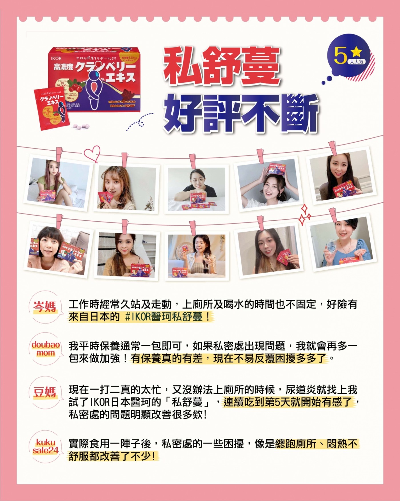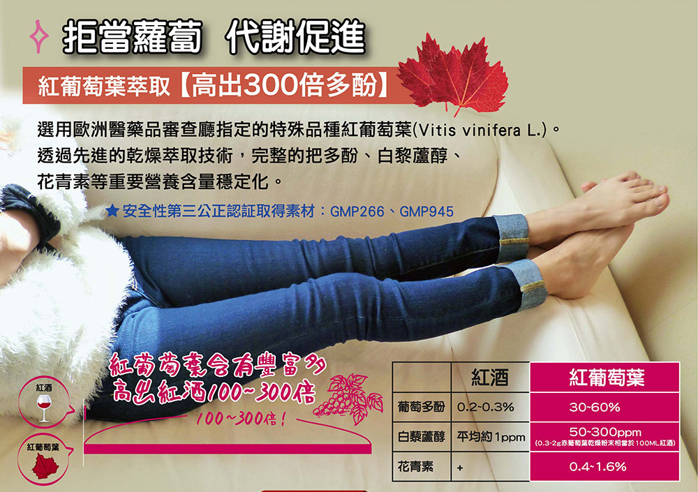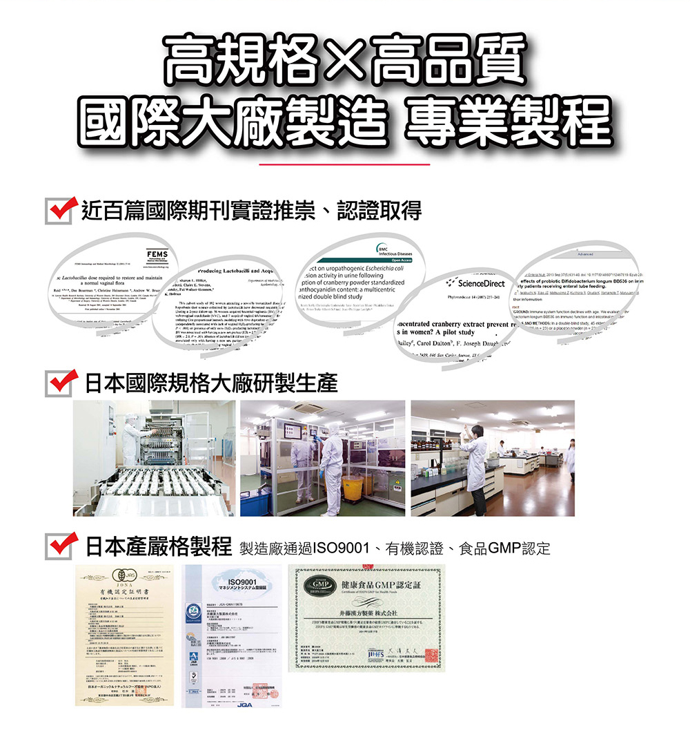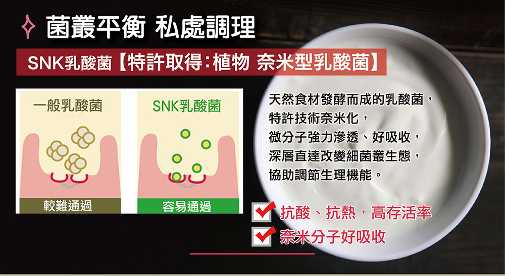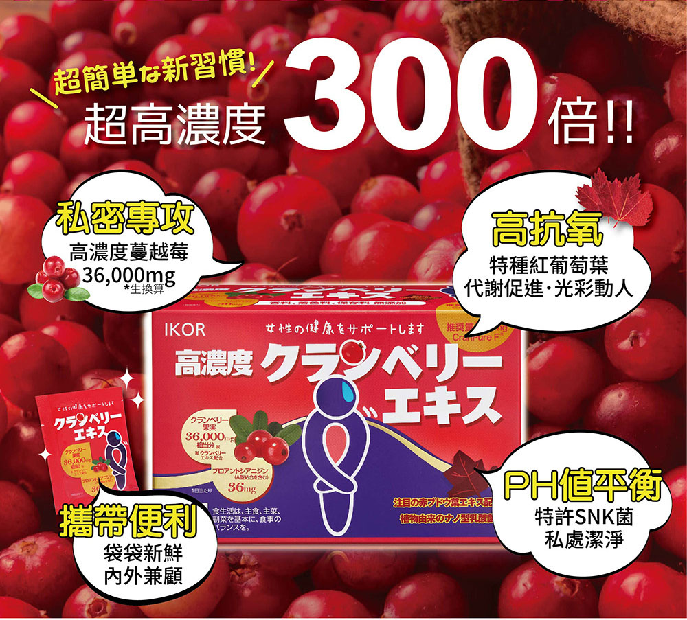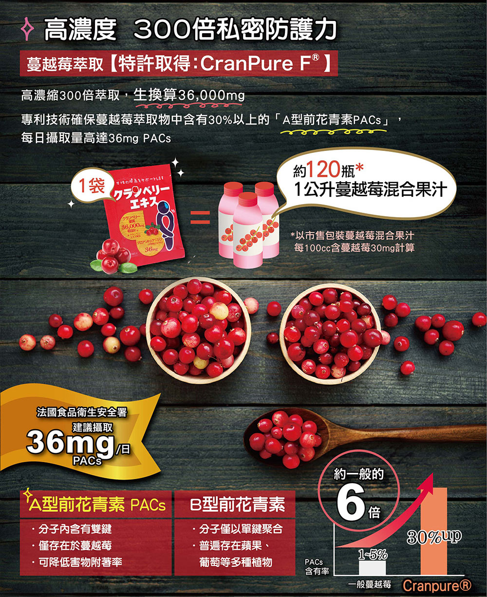 主成分:蔓越莓萃取物(含前花青素)Cranpure F® 300倍濃縮、植物性奈米型乳酸菌SNK®、紅葡萄葉萃取物