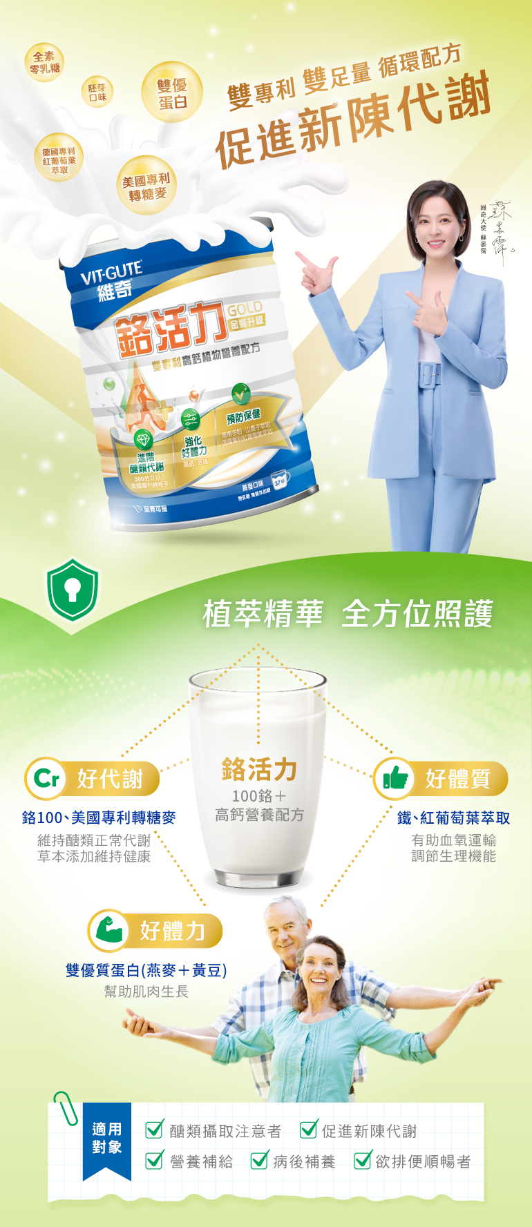 強健循環:德國專利紅葡萄葉萃取物、維生素E,具抗氧化力,協助新陳代謝 ; 雙重植物蛋白質(燕麥+黃豆),可用於肌肉生長