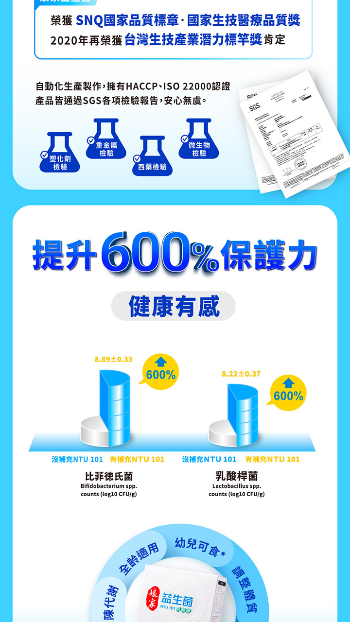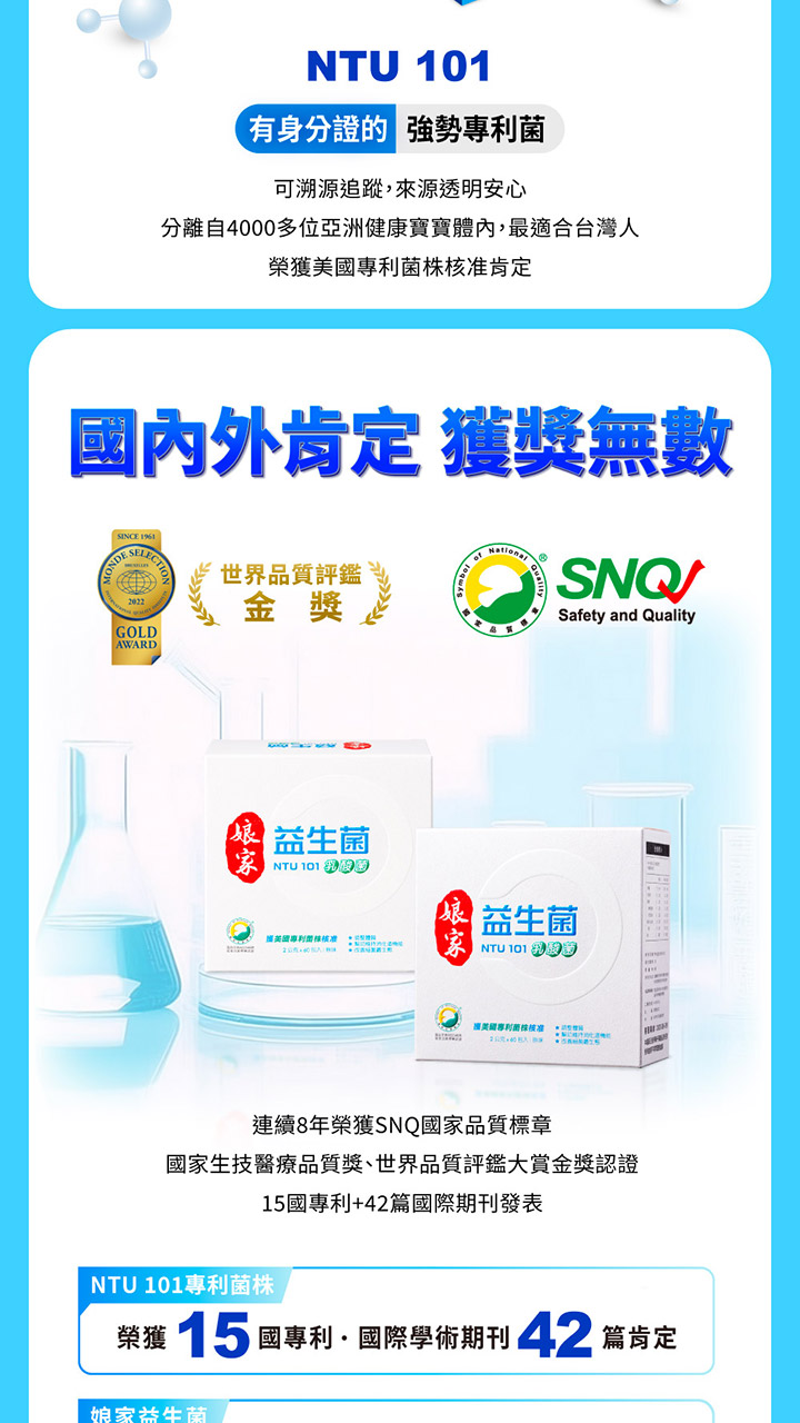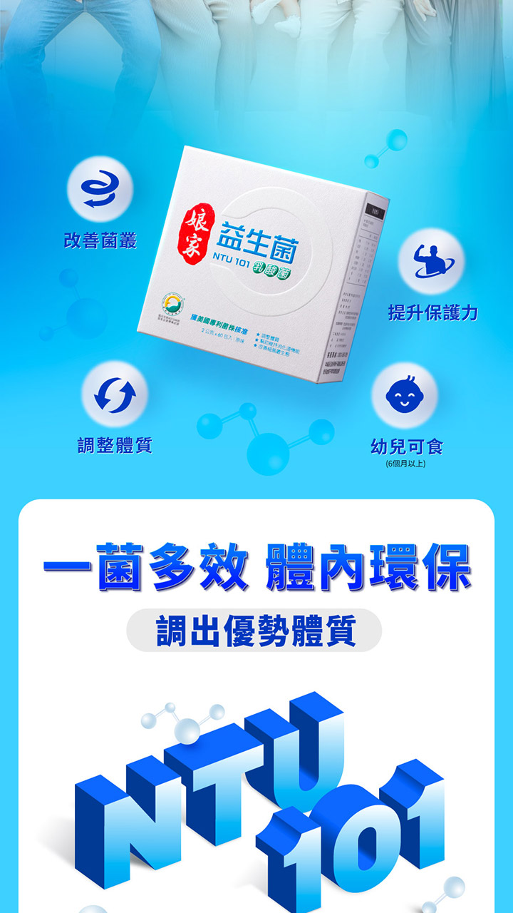 成份:非基改玉米澱粉、糖粉、脫脂奶粉、NTU 101 乳酸菌、異麥芽寡糖、香料 (優格香料)、著色劑 ( β-胡蘿蔔素 (水、果糖、葵花油、辛烯基丁二酸鈉澱粉、 β-胡蘿蔔素、生育醇(維生素 E)、L-抗壞血酸))、調味劑 (蘋果酸、檸檬酸)、酵母粉。NTU 101乳酸菌為技術轉移自國立台灣大學的專利益生菌(副乾酪乳桿菌副乾酪亞種NTU 101菌株/Lactobacillus paracasei subsp. paracasei NTU 101)