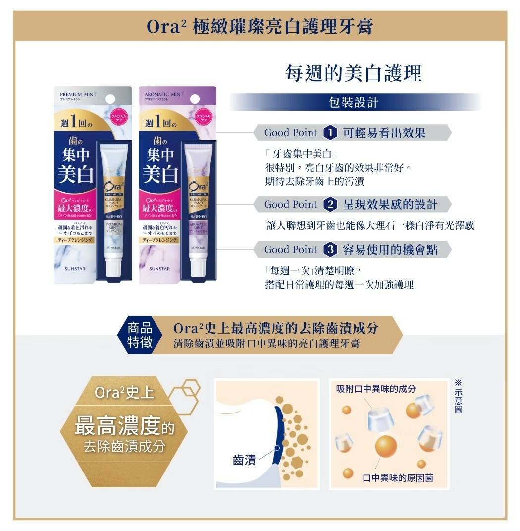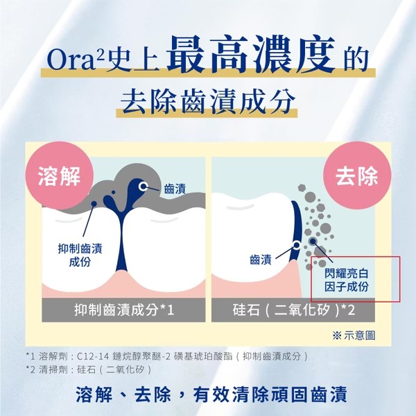 ●含有Ora2 牙膏史上最高濃度的去除齒漬成分(清掃劑)。 一般牙膏難以刷掉的頑固齒漬(齒色附著)都可有效去除,並讓牙齒光滑閃亮。