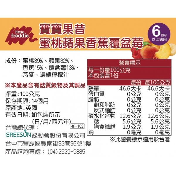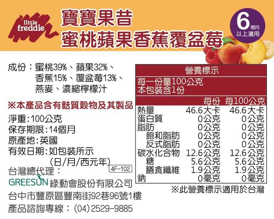 【英國Little Freddie】寶寶果昔-蜜桃蘋果香蕉覆盆莓100g (6m)