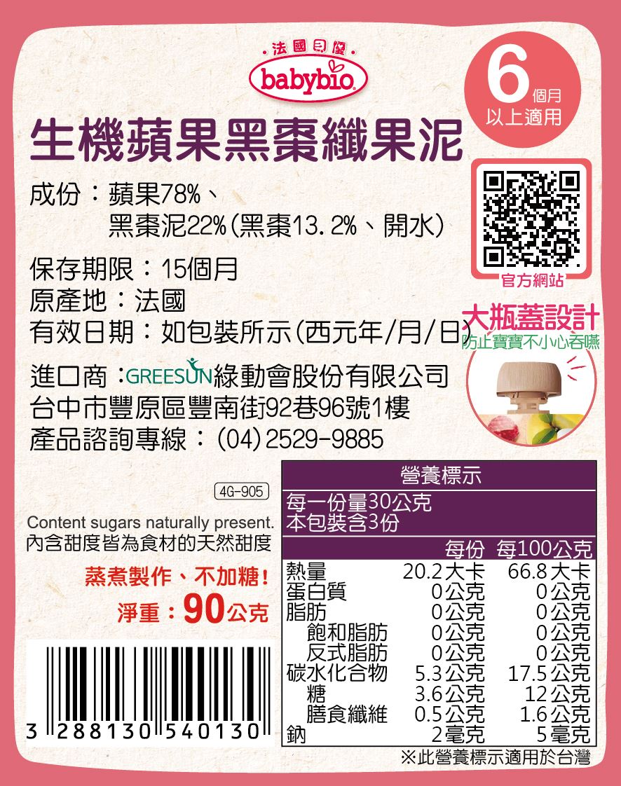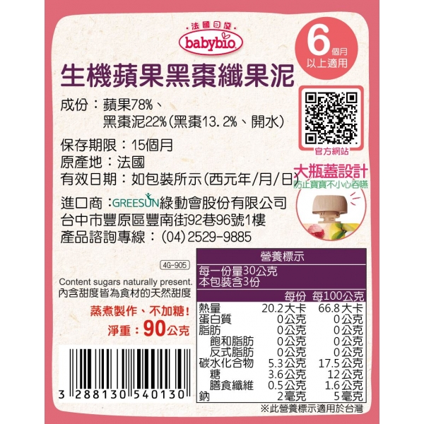【法國BABYBIO】生機蘋果黑棗纖果泥90g (6M)
