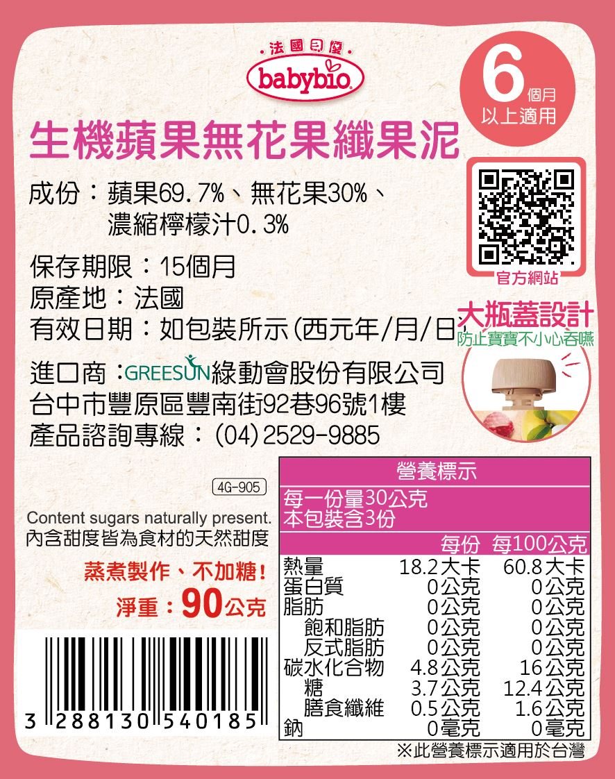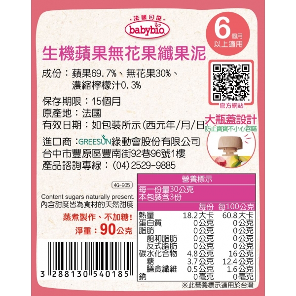 【法國BABYBIO】生機蘋果黑棗纖果泥90g (6M)