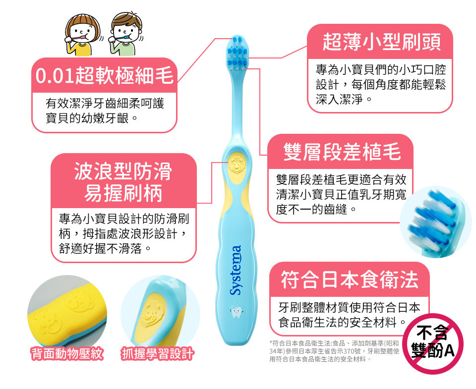 專為2至6歲正值乳牙期的小寶貝所設計的訓練牙刷,可全面清潔乳牙與較寬齒縫間的每個角落,保護好小寶貝的牙齒、牙齦,並幫助牙齒健康發育。