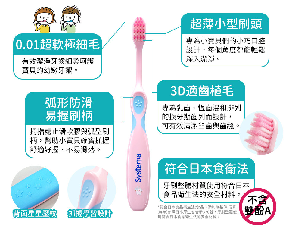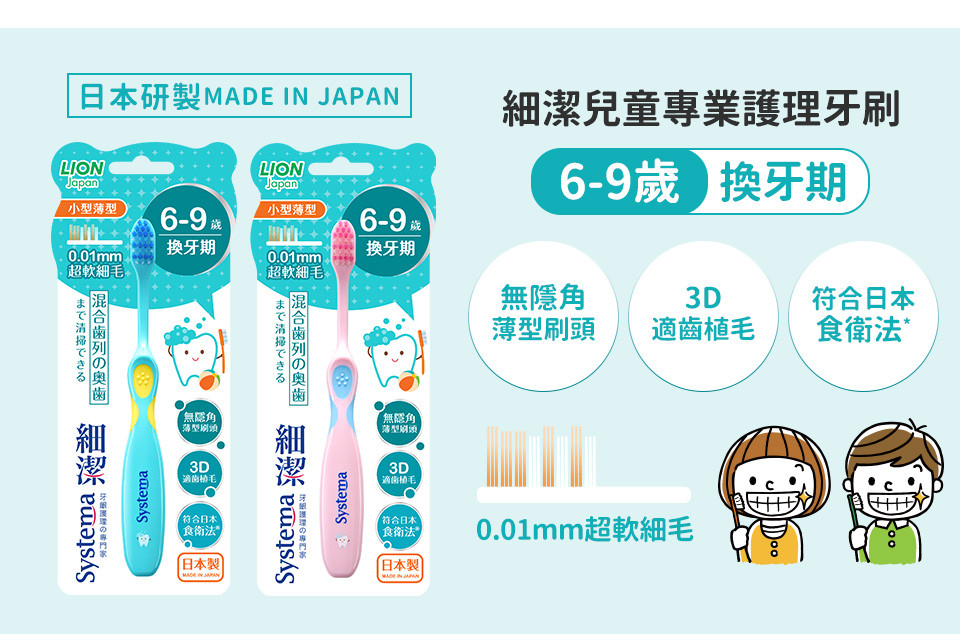 專為6至9歲正值換牙期的小朋友所設計的牙刷,可多角度清潔因乳牙、恆齒混和生長的不規則排列,保護好小朋友的牙齒與牙齦,並幫助牙齒健康發育。