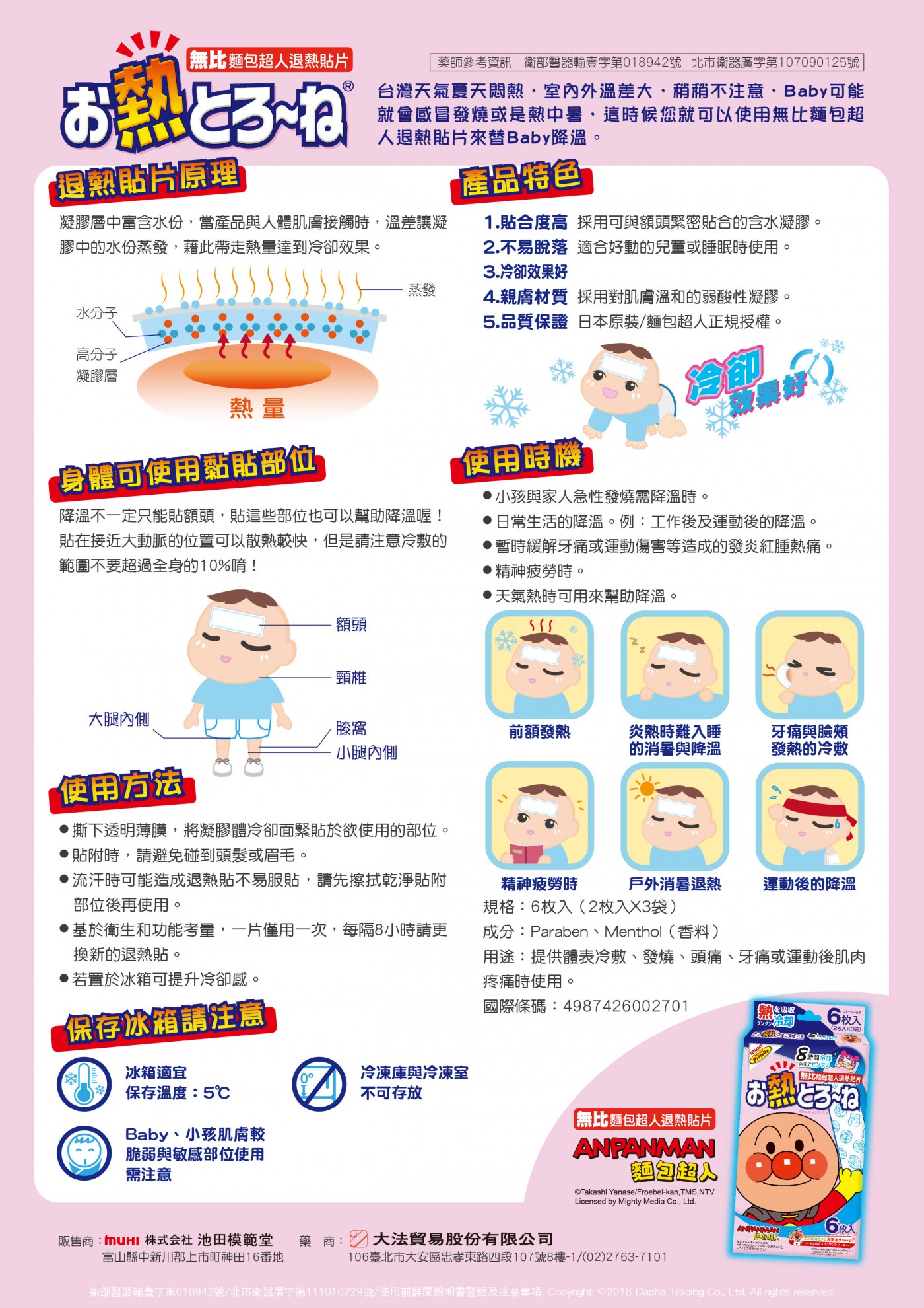 醫療器材許可證所載品名:"無比麵包超人" 退熱貼片 (未滅菌)
